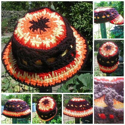 Kaptain Kaaoss Flaming Skull Hat....It is the kind of thing you would wear, if you were a circus entertainer as you entered the ring just before you got shot out of a cannon. The instructions include 3 variations, a cap with a bill. a bucket style, and a burnin beanie. Keep warm this winter imagining your head is on fire. Instructions are in American crochet terms. There are pictures of many of the steps. I include my e mail address on every pattern. I am happy to answer any questions you may have. ...Oh and thank my Muse, Shelly Brecker for this one too....although all she asked for was a cadet style cap with skulls....the idea just somehow burst into flames.