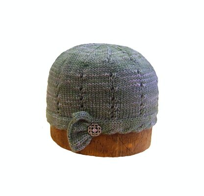 This is a fun and fashionable 20s style hat. It has an east-west band with one cabled edge that ends in a ruffled flourish and is topped with a vintage-looking button. It's knitted in the round with Malabrigo Worsted Merino - soft, fabulous, and available in loads of colors. The button is from JHB. This will fit a large child through an adult.