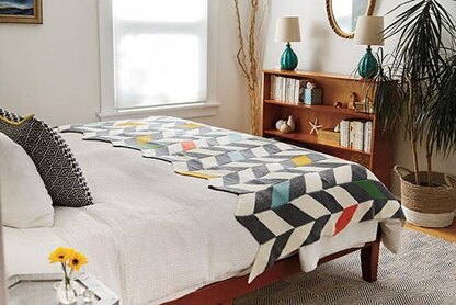 The colour blocks are worked in long Garter Stitch strips, each joined to the one before it as the blanket grows, so there’s no seaming and only one colour in use at a time. Spit splice joins to minimize weaving in of ends. Simple increases and decreases create the chevrons.