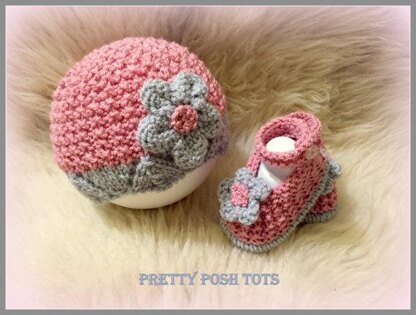 fleur hat and shoes set.sizes 0-3 month3-6 months6-9 monthsmaterials100-150g dk yarn main colour50g dk yarn contrast colour2 buttons for shoes3.25mm needles3.75mm needles