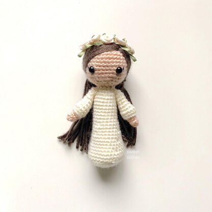 Fleur the Flower Maiden is a sweet but shy nymph who lives deep in the forest. She collects flowers and decorates her fairy house with many different types and colors of flowers. Her favorite, however, are white roses, which she wears on her head! This crochet doll pattern is relatively quick and easy to work up. It requires the basic amigurumi stitches and involves shaping with increases and decreases. The PDF pattern includes instructions to guide you through the entire doll-making process, and includes photo references and a hair tutorial.
