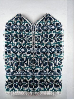 Floral - tiled pattern suitable for knitting with multiple colors. I use four contrasting colors in the charts, the main color is the same throughout. You can add more colors if you want, or use colorchanging yarn to avoid dealing with lots of yarn tails. The construction is traditional, with a thumb gusset. Pictures from Marit (Mitt), but I coloredited one of her photos to show you some color options.