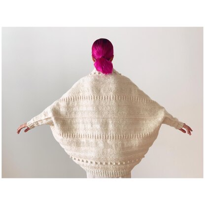 Cocoon is knit completely seamless and requires no sewing or grafting. You start working the pattern similarly to a (really wide) bottom-up sweater in the round up to the sleeves. They are added to the body with a provisional cast on. Then, front and back pieces are worked flat separately and joined using three needle bind off. The cocoon is finished off with the sleeve cuffs knit in the round.