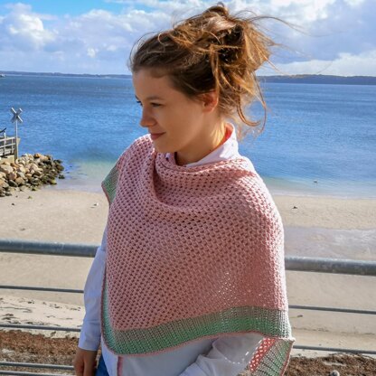 “Florentine” shawl knits up quickly. It’s not too large, well suited to complement blouses or sweaters, and looks sophisticated, especially when made from a glossy yarn as shown.