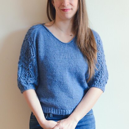 Florescence is a captivating knitting pattern that offers two stylish options: a sweater with long sleeves or a t-shirt with short sleeves. The standout feature of Florescence is its delicate lace sleeves, reminiscent of spring leaves unfolding. The body of the garment is knit in stockinette stitch, with a slightly cropped length that can be adjusted to preference. This pattern is available in 12 sizes, ranging from 34” to 58.5” at bust, and should be worn with some positive ease for a comfortable fit and flattering drape. Florescence can be crafted with fingering weight yarn and a fluffy lace strand (cashmere or mohair), or with a single strand of DK weight yarn. With its top-down raglan construction, Florescence combines elegance with ease, making it a must-have addition to any knitter’s spring and summer closet.