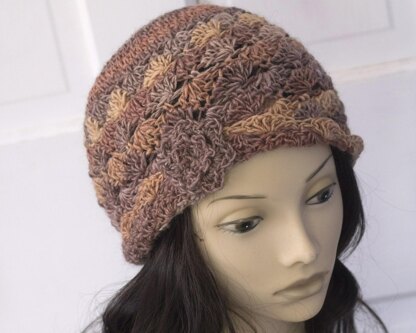 This is a pattern for an easy cloche hat with a partially turned up brim and a little flower. A pretty stitch pattern that looks more complicated than it is. It is crocheted in the round and is suitable for an intermediate crocheter or an adventurous beginner. Works up quickly.