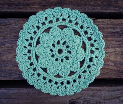 The coaster doily you can make by following this pattern will be approximately 15cm (5.9 inches) in diameter.