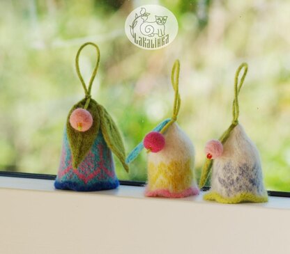 Design details: ● hanging bellflowers with stranded colorwork pattern ● seamless, worked in one piece in the round on 3-4 DPNs ● felted after finishing ● two sizes for flowers ● two leaf lace patterns