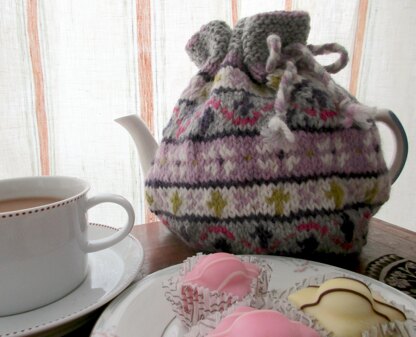 This is a pattern for the Flower Fairisle tea cosy, part of the Make at Home range of knits for the home. It has an all over fairisle pattern on the front, and is striped at the back, with garter stitch borders. 23 cm wide x 22 cm deep.
