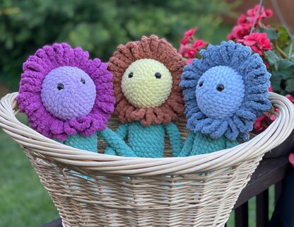This is a super cute farm styled sunflower doll pattern. It’s approximately 14.5" tall when completed. This pattern is made with Bernat Blanket yarn. I like Premier Parfait as well. 1 skein of 3 colors will make a few dolls.
