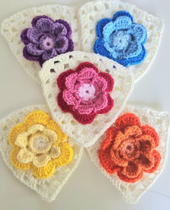 Supplies: *(For both the square and triangle) about 20 gr of yarn /color (cotton, acrylic or mix), and a 3 mm hook (UK 11) (US D). I used 3 colors of the same color palette for the flowers, and white for the border. Also needed: tapestry needle for weaving ends, and scissors. Stitches: chain (ch), stitch(es), chain space (ch-space), skip (sk), slip stitch (sl st), half double (hdc), double crochet (dc), treble (tr). American terminology used. Square /triangle measurements: 15 x 15 cm / 5.9 x 5.9”.