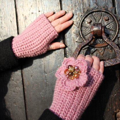 One of the mittens is adorned with beautiful crochet flower and beads.