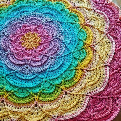 RAINBOW BLANKET MEASURES 49 INCHES ACROSS. But the pattern allows you to make it as large as you like by repeating the last sequence of rounds. There are instructions in the pattern in Note #5 for modifications to go larger.