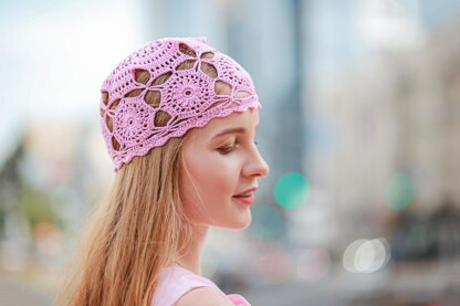 Women's hat pattern "Flower Square" in one size: adult female beanie (~21.5" circumference and ~7" depth).