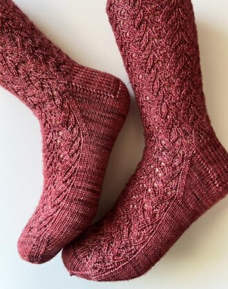 These top-down lacy socks feature an easy-to-remember stitch pattern and look great in a range of yarns. The pattern includes written and charted instructions for two sizes.