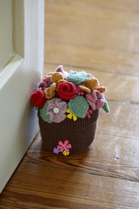 The pot and soil section is knitted in one piece with the side seam sewn, and card is used to keep the bottom flat. The flowers are all individually knitted and attached with an assortment of buttons to create the focal point.