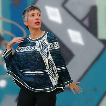 Not a sweater, not a poncho, Flying Diamonds is a cozy layering piece, inspired by a shiny and colorful graffiti on a wall near my house.