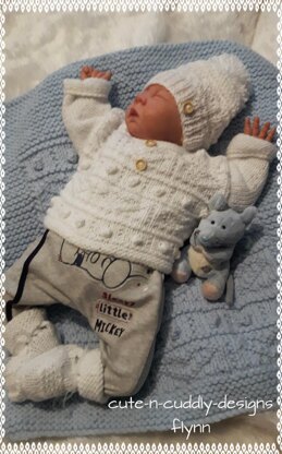 A JUMPER AND MATCHING PRAM/ MOSES BASKET / CAR SEAT BLANKET , INCLUDING HAT AND BOOTEES . THE SET CAN BE KNIT IN D.K OR ARAN DEPENDING ON WHAT SIZE YOU REQUIRE . THE BLANKET IS KNIT USING CHUNKY YARN
