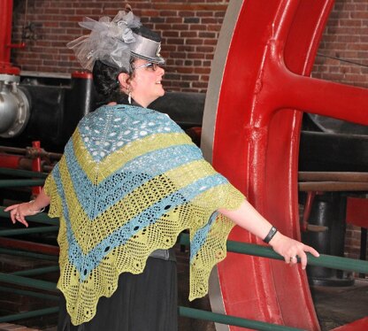 This triangular shawl is worked from the top down. Flywheel begins with a garter-stitch tab and progresses through all stitch patterns with regular increases at the spine and both edges. The shawl is designed to be made with two skeins of fingering-weight yarn in complementary colorways (choose semi-solid or tonal colorways for best results). Clues alternate between the two colorways, resulting in broad stripes. Each clue features a different stitch pattern, with transitions between clues