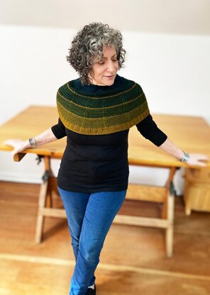 This colorful, textured, over-the-shoulder shaped cowl will be the one you reach for. Its slim fit is perfect for extra warmth under your jacket or by itself on a foggy morning!