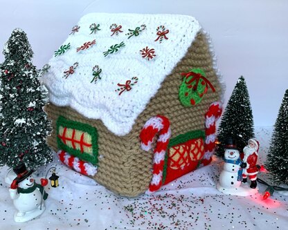 Ta Da! Now you can easily knit an adorable large size Gingerbread house for your dining table accent! This finished house is approximately 10 inches high, easily made in sections and sewn together. Add embellishments and fun novelty items to create a cute Winter scene! This is easy to knit and assemble! We made one in less than 3 days, start to finish. You will need worsted weight yarn, pillow or toy stuffing and knitting needles US # 8 and # 9. Yes, it is fun and easy to knit, and makes a great gift!