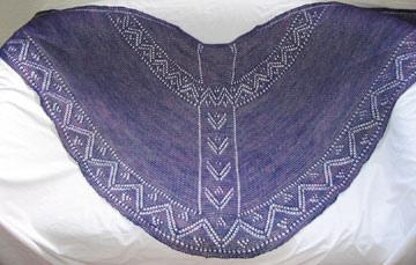 The shawl features a center panel of graduated lace motifs and bands of lace at the shoulder and the bottom edge. Superb fit with the ease of garter stitch and a bit of lace.