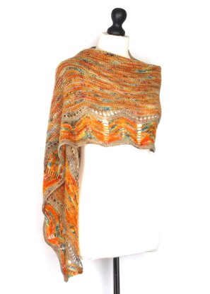 Fonseen starts with a wide crescent with eyelets. Then short rows are worked to create a sweep of length and colour across the garment. Finished with a curvy border, with double yarn over polka dots.