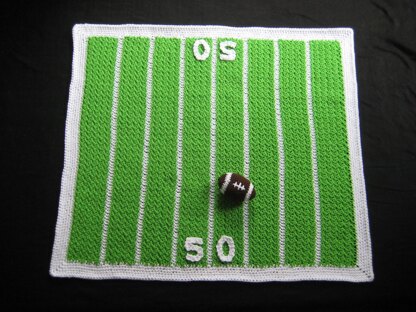 Made to resemble a football field with numbers sewn on separately. Green field has a texture look. This would make a nice photo prop or gift set for any football fan! Blanket is large enough to be used as a floor play mat. Football is a stuffed toy with rattle inserted inside. Very easy pattern stitches for an elegant look. I used 2 - 7 oz skeins of green and approx 1/2 skein of white.