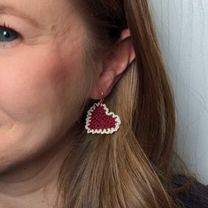 I have a distinct memory of making a satin pink Valentine’s box with my mom when I was about 7 years old. It was beautiful with doilies and paper hearts all over it! These hearts remind me of a little paper doily heart, that is what I was trying to evoke! Use your favorite 1.5 mm hook, size 10 thread, earring findings, glue, and stiffening spray to make these earrings.