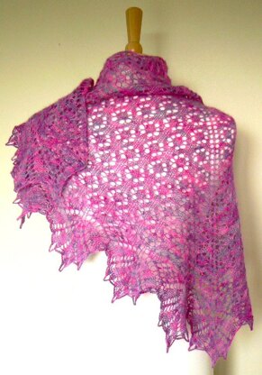 This shawl was inspired by primroses and wood anemones glimpsed on the forest floor on a sunny spring morning.