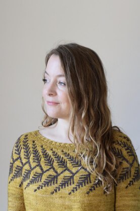 Forestland is a top down and seamless circular yoke sweater that knits up quickly. This pattern calls for just two colors of yarn and is suitable for stranded colorwork beginners since the motifs are simple, rhythmic and easy to knit. Inspired by forest foliage: ferns, pine boughs, cedar - open to knitters’ interpretation. :) DK or worsted weight yarn. Designed to be worn with 2-6”/ 5-15 cm positive ease. Shown in size B with 4” / 10 cm positive ease.