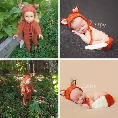 This is a pdf knitting pattern, written in English and using standard US terminology, for you to knit a fox bonnet and tail for babies and dolls.