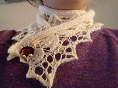 - Fingering weight or sock yarn all work for this project. You can use any kind of pretty pin for this piece. or even a shawl pin.