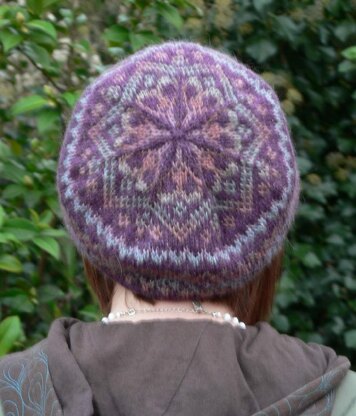 This is a traditional Fair Isle beret knitted with a solid colour yarn and a long colour change yarn to give the impression of lots of colours being used in the design.
