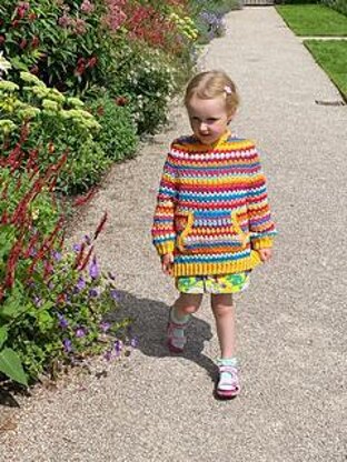 The pattern gives details to make this generously sized hoodie, which is worked in one piece for body and sleeves, with the hood and pocket added. The stripes are created using a zigzag stitch, which is written. Charts are included to support with the raglan and pocket shapings.