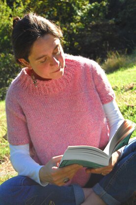 This sweater is knit in the round top down from the collar to the hem in one piece with short rows for back of neck shaping and hem. Sleeves are picked up from live stitches and knit down separately. The method is a hybrid contiguous/raglan. I used New Lanark 100% pure wool aran. Suitable alternatives are listed.