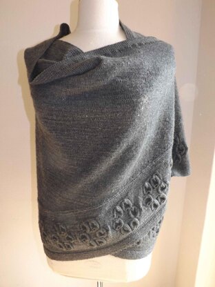 The French Anemone shawl is a shawl that have long ends that will drape gracefully around the shoulders and keeps in place without a pin. The shawl is knitted in one piece starting at the outside edge of the shawl. The shawl has a textured stripe with raised flowers.