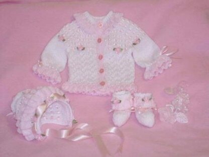 Frilly Edged Cardi, booties and bonnet ref:11