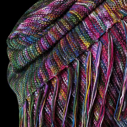 This shawl begins at the bottom center point and expands outward. Extra stitches are cast on that will later be unraveled to create the fringe. At the halfway point, the edges are joined but the stitches are also split at what used to be the center, so you’re still working back and forth in rows, rather than in the round. This construction is a little unusual, so I’ve included diagrams at each stage to try to help you visual what you’re doing.