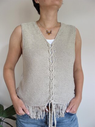 This sleeveless top is perfect for the summer as a solo garment when it is made of cotton/linen but can also be made with wool - then it is an ideal additional layer on cold autumn/winter days. The tie at the front adds a boho character to the tank. The vest is made seamless from the bottom up and the trim is done at the same time so it's a quick and satisfying knit.