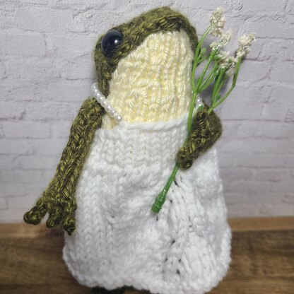With wedding season on the way, Froggy needed some options for getting dolled up (pun Intended) Dress is made using the same weight yarn and needles as the frog.