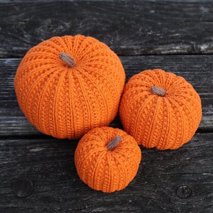 The pattern includes written instructions and charts for knitting in the round small, medium and large pumpkins (it is not necessary to read charts).