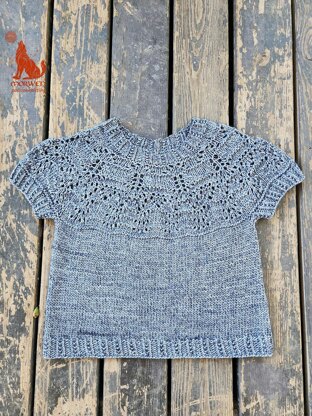 The tee is absolutely seamless. It’s worked in the round, top-down and has a round yoke decorated with laces. On the edges, it’s worked with an attractive variation of a half-twisted broken ribbing. The back is raised with short rows, which is optional: the tee could be successfully worn without them. The pattern is very friendly to beginners; it contains clear, complete instructions, as well as links to captioned video tutorials.