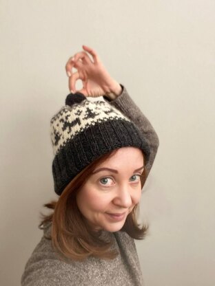 This is a cozy, winter-ready beanie featuring traditional Fair Isle motifs with playful reindeer designs. This charming hat is perfect for anyone who loves classic, Nordic-inspired knitwear.