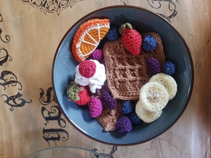 Crochet your own set of yummy Fruit Waffles and Whipped Cream. They look good enough to eat! Children will love playing with this set. Paintbox Cotton DK is used and a 3mm hook but any DK yarn is fine. Only small amounts of yarn are used for fruit and a little toy stuffing.