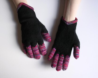 Knitting gloves with fingers can be a bit of a challenge. To make it easy for you, these gloves are done in stocking stitch with a bit of garter stitch only – but nonetheless with a lot of effect due to the contrasting yarns and all the pointy bits!