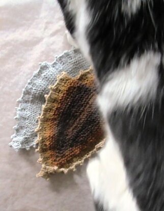 Furballs' Simple Eyes 3 (short scarf version) is a 19" x 6 1/2" / 48.3 cm x 16.5 cm oval shaped short scarf using simple garter and broken rib stitches. The highly decorative border is more than pretty look, it is also the "button" of the scarf for securing. The short scarf is good for all season: air conditioning room in the summer, cool early morning and evening working in the garden, and cold winter night watching TV. It is small and compact enough to find space in a handbag, a corner of the bottom drawer of office desk or the glove compartment of a car.