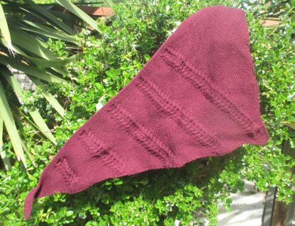 After blocking, the finished shawlette measures 16.5” high at the deepest point and 36.5” across the top edge. Pattern gauge is 21 sts and 40 rows to 4” over garter stitch. Achieving pattern gauge is not vital but may affect the finished size and the yardage required. As well as the yarn and needles, you will also need a cable needle (or to cable without one) and 12 stitch markers.