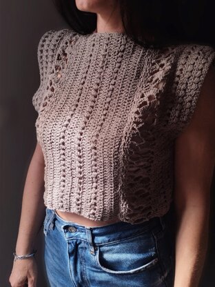 Galia top is a crochet top that combines different textures and lace stitch in sand tone inspired by the warm days.