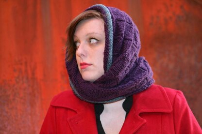 Galiano is a reversible moebius cowl that is deeper and narrower than most moebius scarves or cowls, so that it can be worn in one layer around the neck or up over the head like a hood. It starts with Cat Bordhi's moebius cast on and moves out from there in a reversible geometric stitch to a contrasting border. Instructions are given for both an I-cord bind off (as in the sample) and a rolled edge.